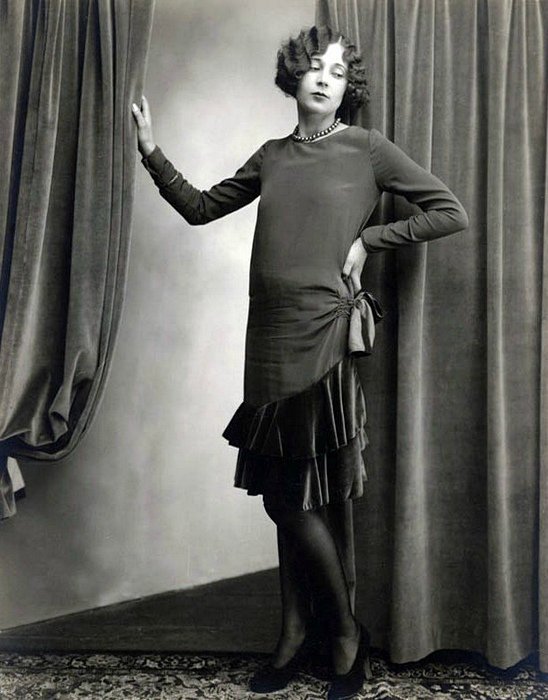 А так платье не должно быть именно флаппер, там фишка в прямом силуэте + без рукавов + украшение на шею, тонкое, но очень длинное, можно во много слоев, висит до талии спереди. Если узор, то ар деко или ар нуво. Само платье не жесткое, не как футляр, тогда женская мода чуть ли не впервые стала удобной.