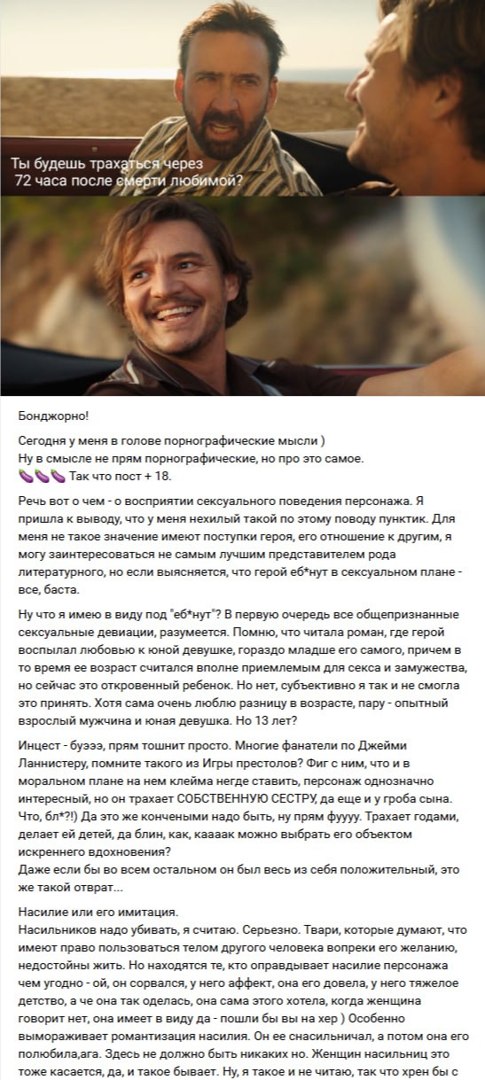 А что плохого в целом в бомблении? Собственно в эмоциях? Все так пренебрежительно сейчас к этому относятся, как будто в этом есть что-то плохое - говорить то, что думаешь и чувствуешь. Для меня напротив, молчать и потом что-то за спиной устроить пакостное - это прям фу, вот это как раз поведение лицемера и тряпки (ну примерно как у автора поста) Впрочем, доказывать здесь, что у меня не бомбит бессмысленно, но отказать себе в удовольствии вменить лицемерие и трусость "главному заклепочнику", " объединителю фандома" и гениальному фикрайтеру всех времен - бесценно