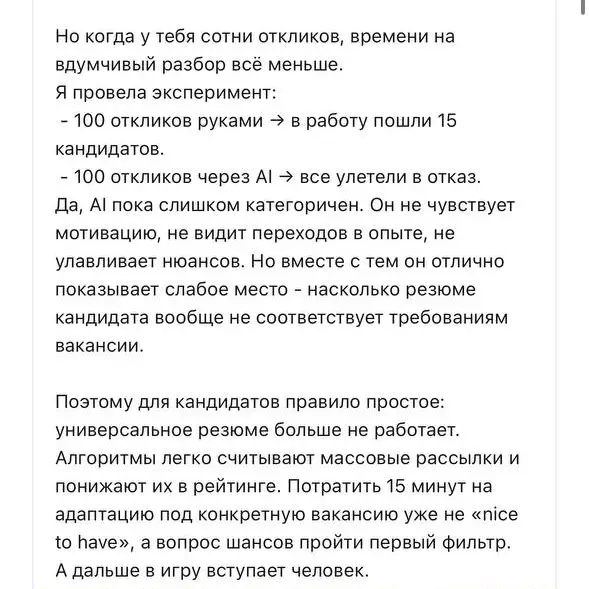 Видел пост, где эйчарша рассказывала, что провела эксперимент - отсмотрела 100 резюме, из них подходящих кандидатов выбрала 15. Потом этот же скоп резюме дала ИИ, и он просто все их отшвырнул, никто не подошел, по его мнению.