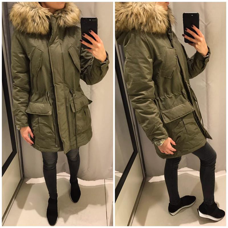 Я увидела обычный пуховик темно-зеленого цвета. Ни насыщенности, ни припыленности. А самый обычный цвет. Пройдешь и не заметишь, как и сам образ